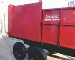 Carreta para transporte agrícola. Com pistão hidráulico. Com sistema exclusivo de tampas que facilitam a descarga da silagem. Tem a maior capacidade de carga da categoria (8m³).
